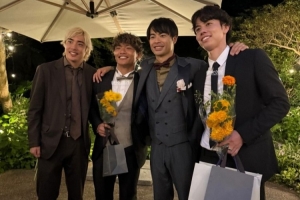照片中伊东纯也、田中碧和旗手怜央将三笘薰围在中间,四人身着正装。伊东纯也为照片配上表情,向三笘薰送上祝福。