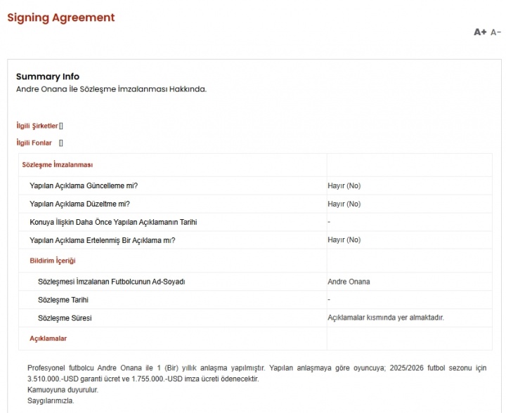 据土耳其资本市场委员会(KAP)发布的重大事件披露显示,奥纳纳租借期限为一年,球员基础薪资351万美元,签字费175.5万美元。
